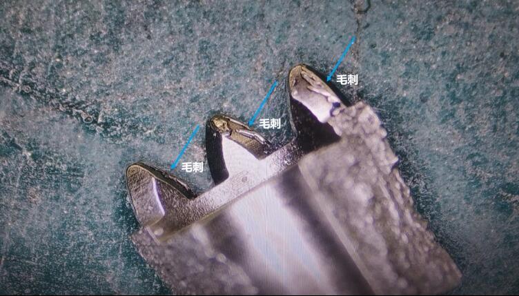 我们先把微型齿轮切开,来看下去毛刺前的状态,可以看到毛刺几乎已经完全包裹在微信齿轮的齿边缘了。人工去毛刺的话,一个齿轮就要3分钟。而这么大的毛刺,磁力研磨机是去不掉的。但是用磨粒流设备,我们可以一次装夹至少60个,将时间设置为1分钟,这样上机时间只需1分钟就可以加工60个,单独再找个人清理残留磨料,一天下来可以加工几万件,效率非常高。