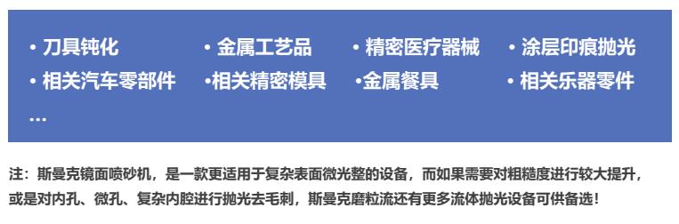 镜面喷砂机,采用弹性磨料直接喷射至抛光面,进行滑擦研磨,虽然粗糙度提升有限,但是亮度非常好。非常适合一些复杂表面抛光或是盲孔抛光。