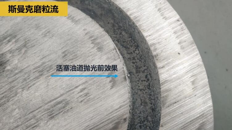 活塞内冷油道是活塞自身冷却的重要结构,通过冷却液循环进行降温。而活塞冷却油道呈环形,一般工艺根本无法对其抛光。但是不抛光不行,因为铸造后的油道内壁非常粗糙,有很多凸起颗粒,氧化物以及其他脏污。如果不抛光,冷却液或油在通过时会被污染,以及携带众多颗粒物,时间久了会有氧化沉积或堵塞风险。所以,我们现在用伟德victory 磨粒流工艺,对活塞油道内孔进行抛光,看看效果如何。